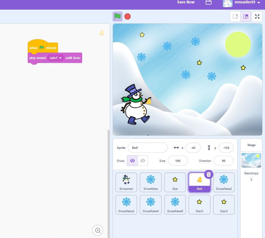 Jelöld ki a harangot, majd a Code fülben az Events alatt a When (zöld zászló) clicked. Lépj a sounds-ra és illeszd a zászló alá a play sound [] until down-t. Itt most csak a beépített hangok közül válassz ki egyet, de otthon tölthetsz is fel neki karácsonyi hangulatú dalokat is.
