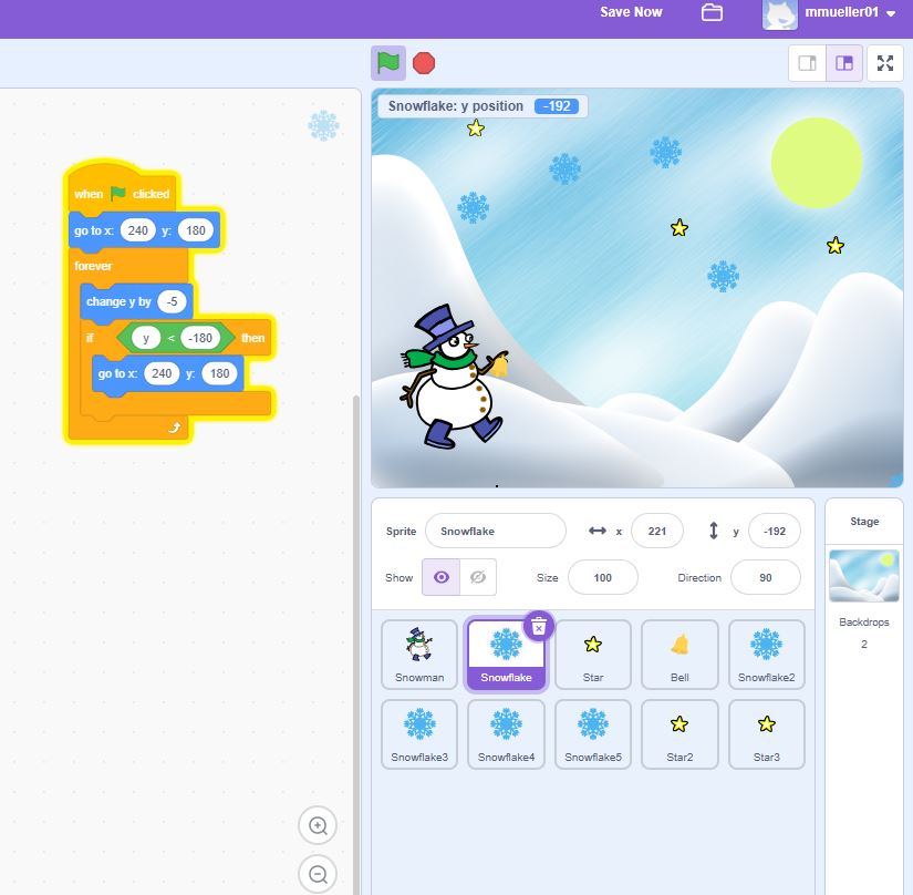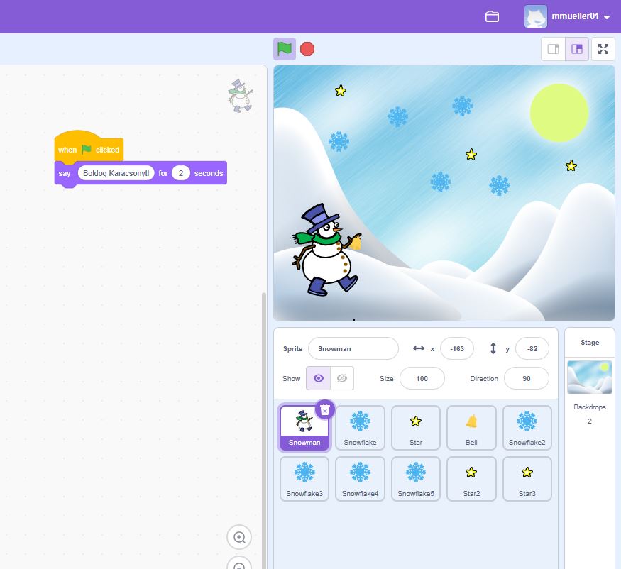 Válassz meglévő sprite-okat a Scratch galériájából (pl. hóember, csillag, hópehely).