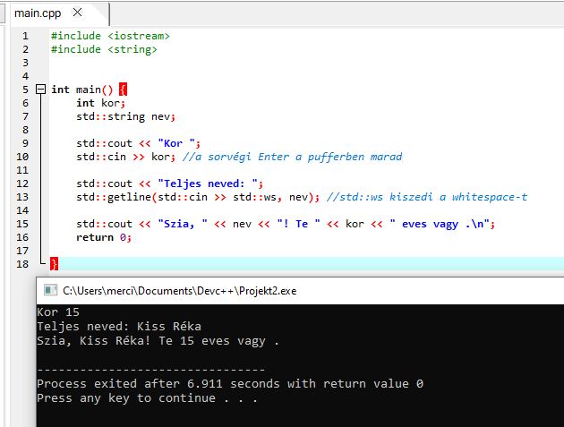 std::getline(std::cin, s)→ teljes sor az Enterig (szóközökkel együtt). >>utángetlineelőtt:ignore(..., '\n')vagygetline(std::cin >> std::ws, s).