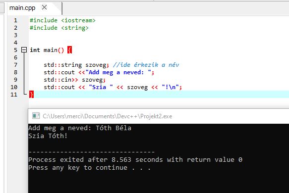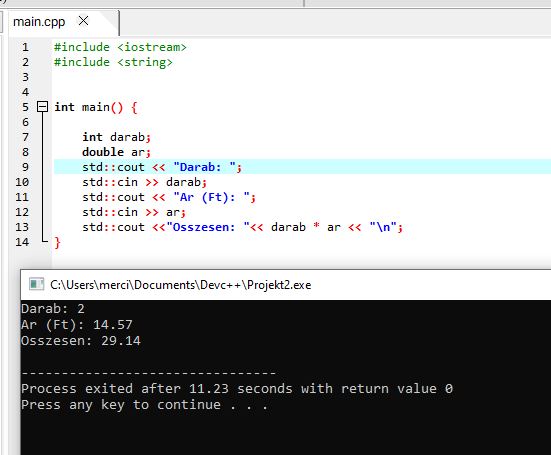 A következő fejezetben a változókról és típusokról beszélünk (egész, valós, karakter, szöveg; névadás, alapértelmezett értékek, típuskonverziók, const), hogy a most beolvasott értékeket jól tudjuk tárolni és számolni velük.