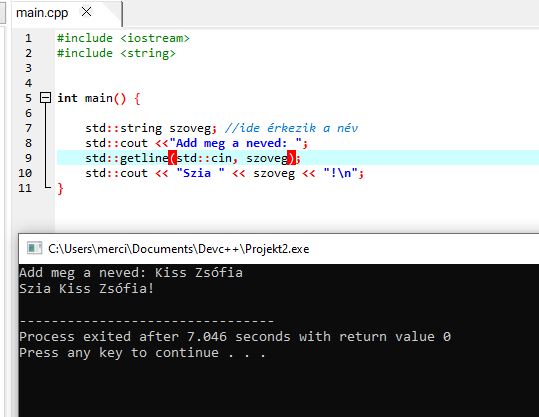 Szöveget std::string-be, számot int/double-ba teszünk. A változónév lehet betű, szám, alsóvonás, de nem kezdődhet számmal és nem lehet kulcsszó (pl. int, double, return stb.)