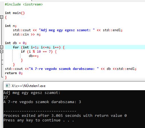 Kérj a felhasználótól egy n számot. Ezután vizsgáld meg 1-től n-ig minden számot, hogy 7-esre végződik-e. Számold meg, hány ilyen szám található