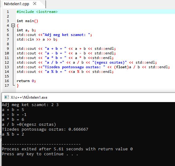 1. – mindkét operandus, az 5 és a 2 egész szám (int) Egész számoknál a C++ levágja a tizedes részt.