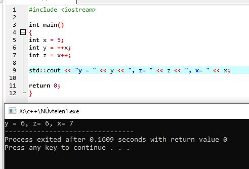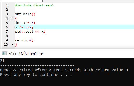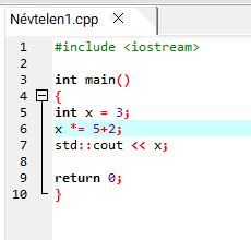 | ++x | növelés eggyel (prefix) | ++b; | b = b + 1; (ugyanaz, mint b += 1) | b értéke azonnal nő |