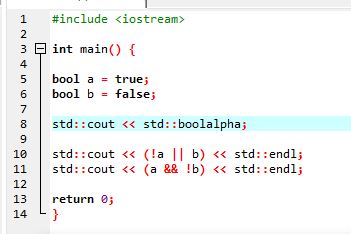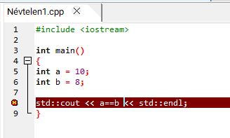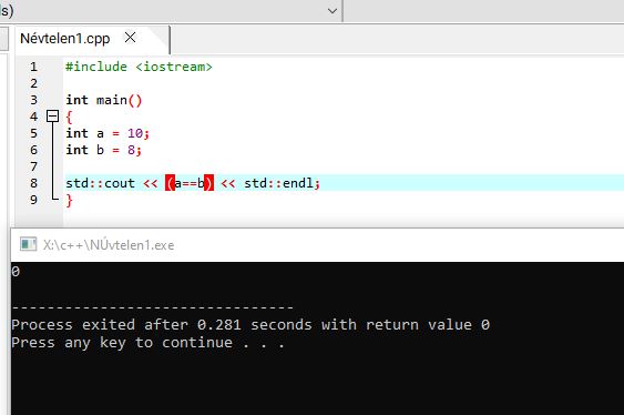 A true = 1, a false pedig = 0-ként jelenik meg. Itt érdemes azt is megjegyezni, hogy a << kiíratás jele is egy operátor, aminek ráadásul a precedenciája magasabb, mint például a == -é. Ezért ez a művelet hibára fog futni: