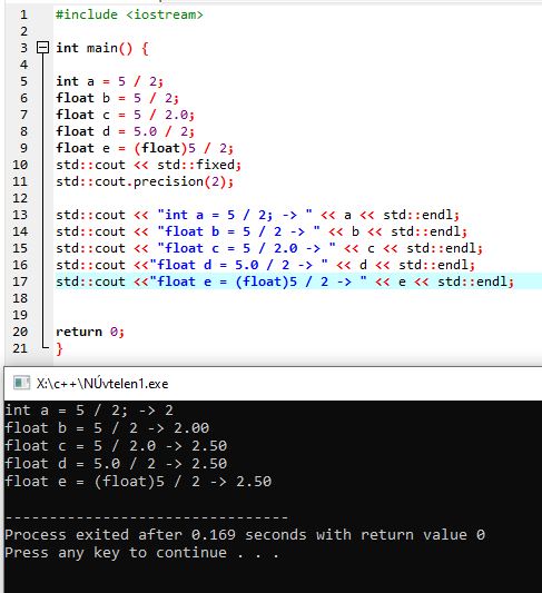 2. float a változó, de a művelet két int között zajlik. Kiszámolja az osztást egész osztásként és csak az eredményt alakítja át float típusra
