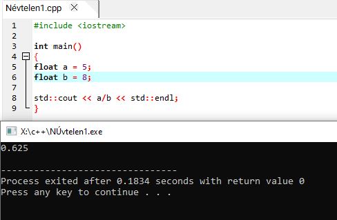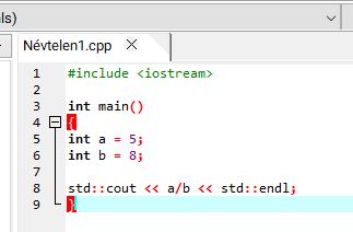 Ha ezt beírod, az eredmény 0 lesz, mert az egész számok halmazán az 5-ben a 8 nullaszor van meg. Ahhoz, hogy pontosabb, tizedes eredményt kapj, az int helyett lebegőpontos típust kell használnod, például float-ot: