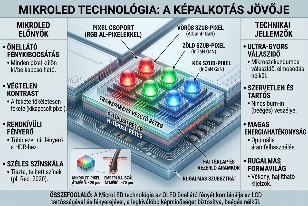 • Kvantumpontos konverzió: Gyakran alkalmazzák azt a megoldást, hogy csak kék MicroLED-eket gyártanak, és kvantumpontokkal (Quantum Dots) alakítják át a fényt vörössé és zölddé. Ez egyszerűsíti a gyártási folyamatot.