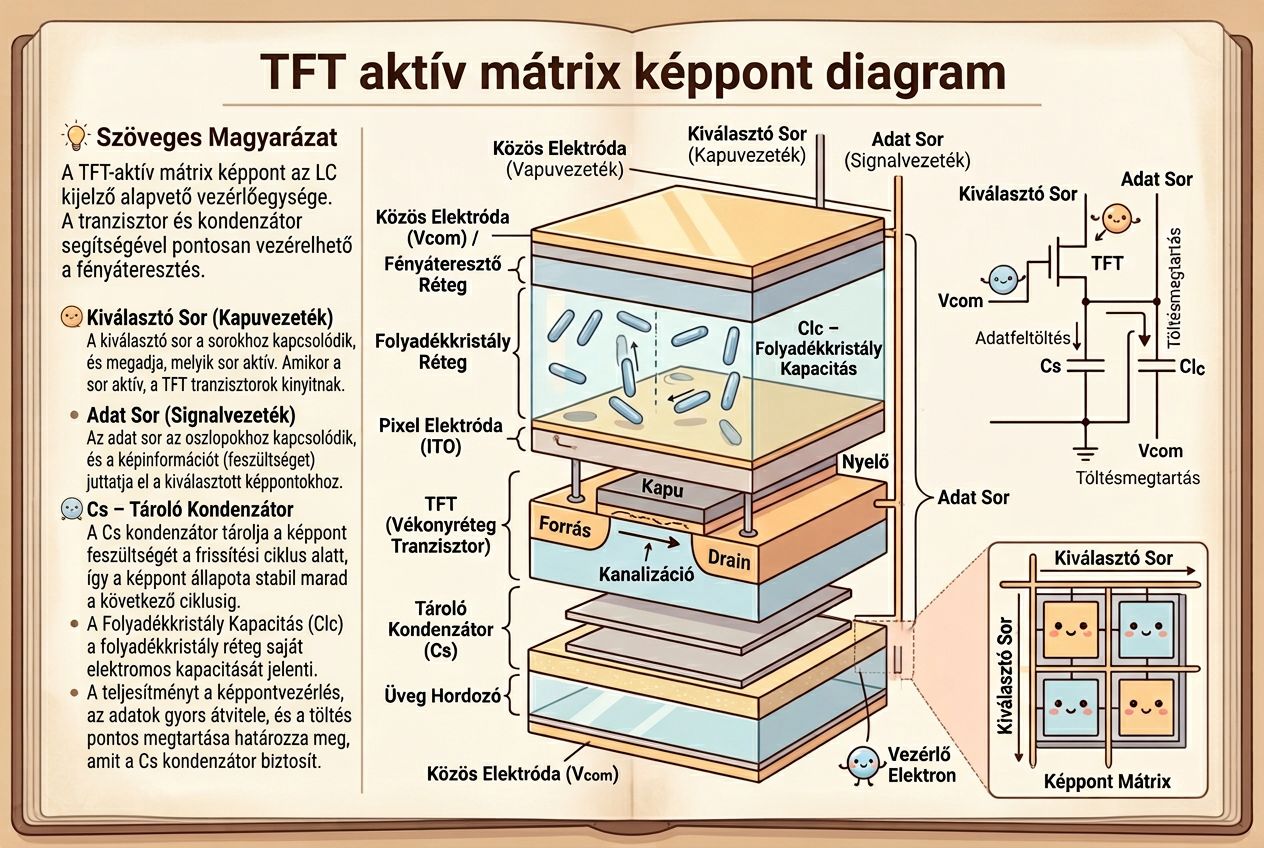 • A tárolókapacitás (Kondenzátor): Ez a TFT-rendszer „titkos fegyvere”. A tranzisztor csak egy töredékmásodpercre nyit ki, hogy beadja a feszültséget, majd lezár. A kondenzátor viszont megtartja (tárolja) ezt a töltést a következő képfrissítésig.