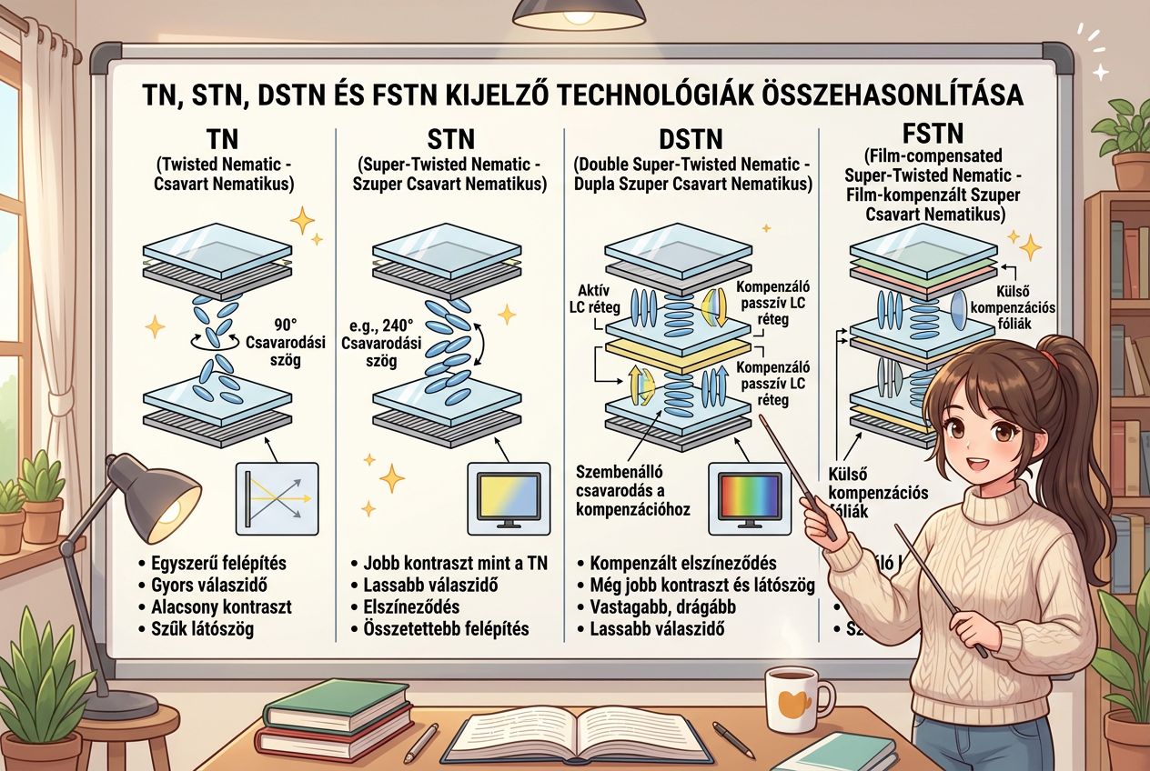 • FSTN: A második kristályréteget egy vékony optikai fóliával helyettesítették. Ez sokkal könnyebb és olcsóbb megoldás volt, így ez vált az ipari szabvánnyá a laptopok és mobiltelefonok (pl. Nokia 3310) előtt.