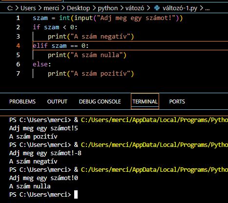 A program először megnézi, hogy a szám kisebb-e nullánál. Ha igen, kiírja, hogy negatív és már nem vizsgálja tovább a többi esetet.