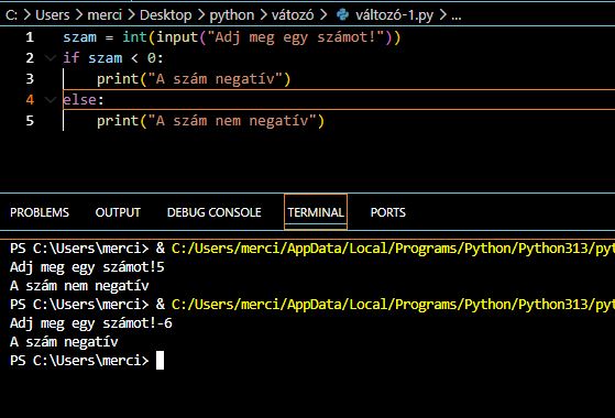 Ez így nem jó, mert a program minden esetben kiírja, hogy a szám negatív, akkor is, ha a felhasználó pozitív számot adott meg. A programnak tehát meg kell vizsgálnia, hogy a szám valóban kisebb-e nullánál. Erre használjuk az if utasítást.